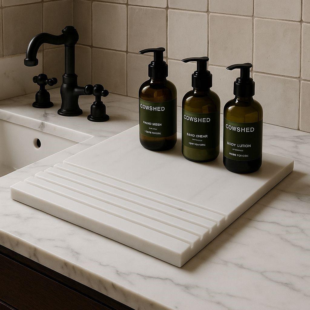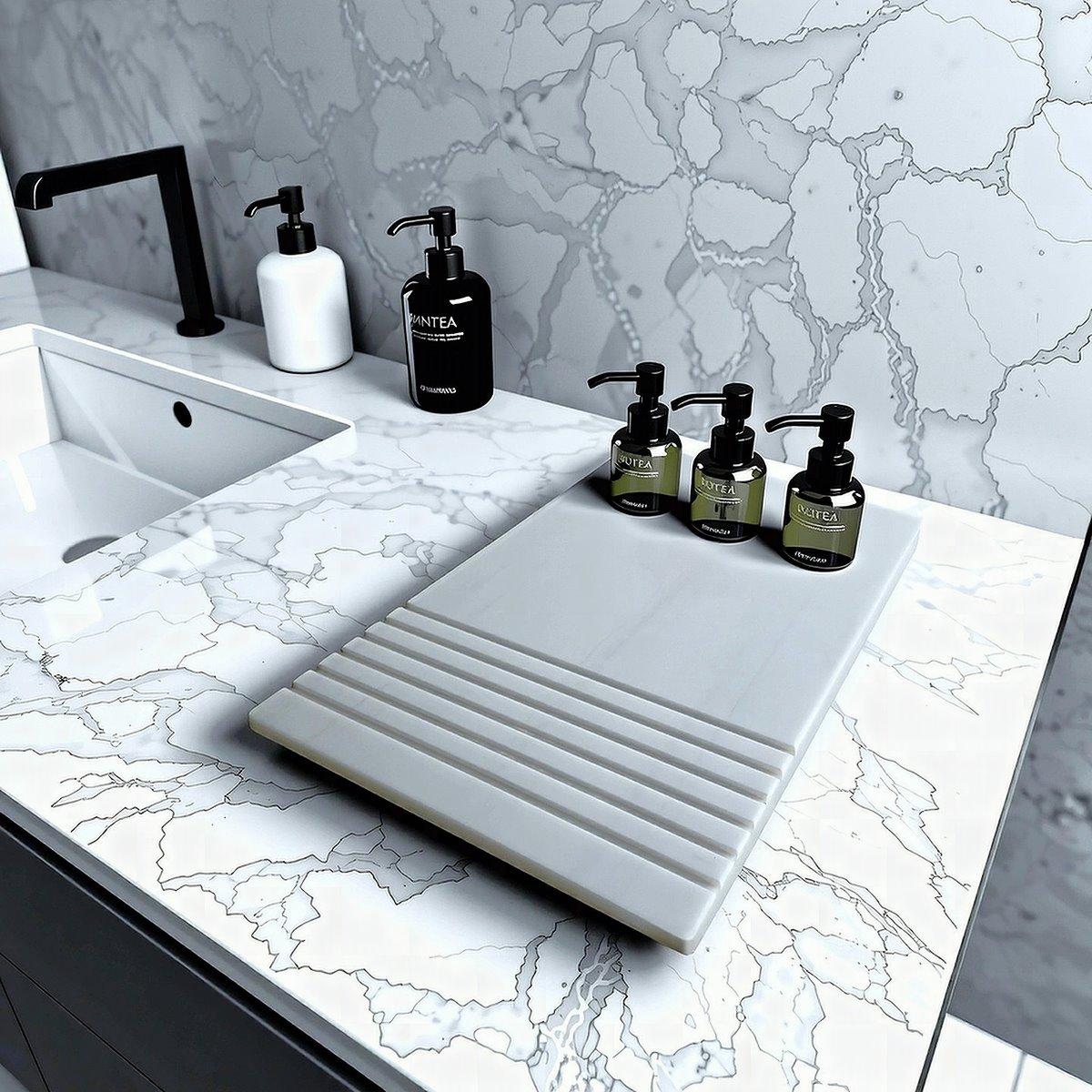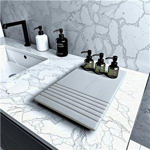 The Carmen White Stone Bathroom Tray with Soap Panel is a statement of refined luxury, seamlessly blending exquisite design with exceptional craftsmanship. Sculpted from premium solid surface stone, its flawless matte white finish is elegantly enhanced by a subtle, stylish grey marble vein, adding a touch of natural sophistication. The integrated soap panel offers both practicality and aesthetic harmony, creating a beautifully composed space for your finest bath essentials. With its sleek, minimalist form and moisture-resistant durability, the Carmen tray is more than just a functional piece, it is an artful expression of modern elegance, perfect for the most discerning interiors.