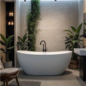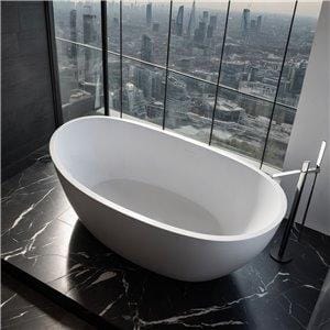 The Fino Cazorla freestanding bathtub is suitable for a luxury five star hotel or for a high end designer bathroom. It is made from a solid single piece of stone material. Not to be confused with acrylic baths, this is a highest quality handmade luxury bath with a contemporary real matt white finish that can only be truly achieved with a solid surface material. The Cazorla is an elegant interesting crescent shape that gives it the real wow factor as well as making it super comfortable to bath in. Not only does the stone material look and feel better than a standard acrylic bath, it is also functional keeping the water warmer for longer for the ultimate bathing experience. This bath measures 1800mm by 850mm, weighs 150kg, has a water capacity of 323 litres and comes complete with a white drain cover.