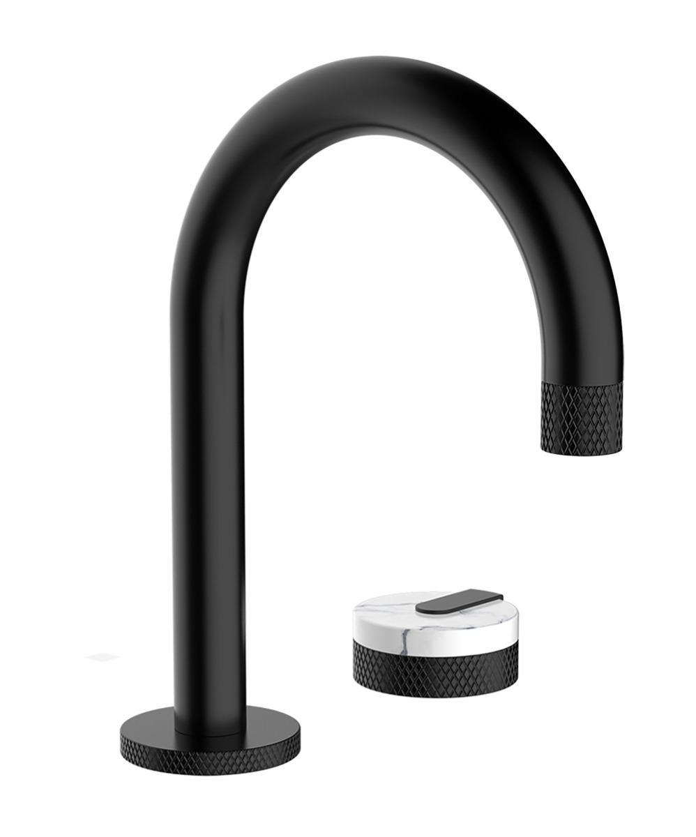 Finish your bathroom to create a modern luxury space with Fino Stone bathroom accessories. They are perfect for a high end designer bathrooms or five star hotels. This beautiful shelf mounted tap in matt black features a unique single white marble handle and is perfect for a marble or white stone bathroom.